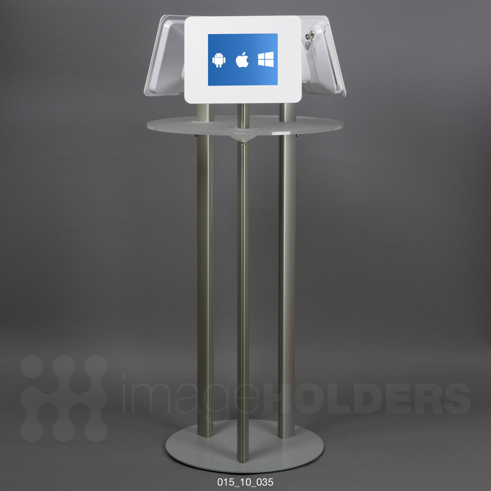 The Expo tablet and iPad kiosk has been designed for businesses which need to show different kinds of content, or want to use different tablets or operating systems. Each enclosure can rotate independently with a range of bezel shapes to chose from. The unit is ergonomically designed for easy use by standing adults in a range of environments. The integrated ‘glass look’ acrylic shelf creates a real focal point and has room for marketing materials or simply a place to put your coffee.