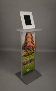 The Expo floor standing tablet enclosure securely encloses the iPad 2017 in portrait, with a branded straight graphic panel and shelf. The graphic panel promotes the services of Eureka Springs, with eye-catching branding designed by Eureka Springs, while the shelf provides the user with a handy platform to place whatever might be in their hands down while they use the kiosk.